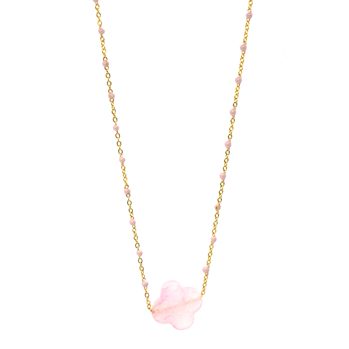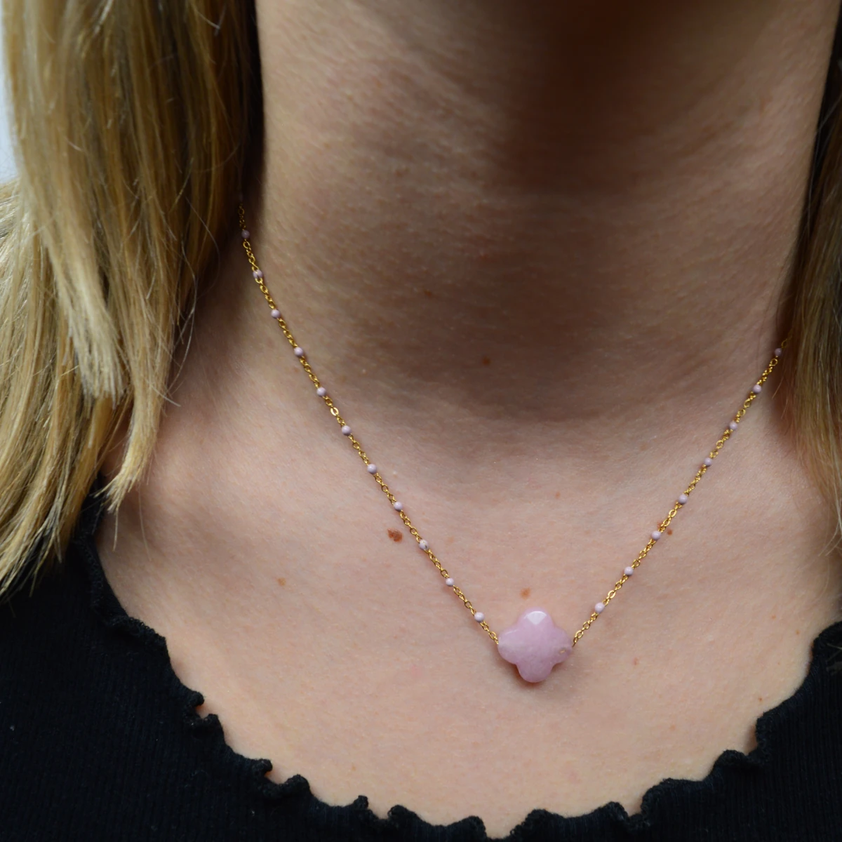 Naszyjnik z koniczynką z różowego kwarcu. Wykonany z wysokiej jakości stali szlachetnej. Różowy kwarc to minerał o delikatnym bladoróżowym zabarwieniu, symbolizujący miłość i współczucie.